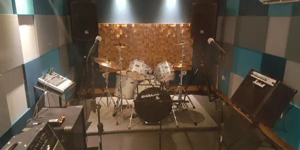 Dispomos de uma sala com 20m² com tratamento acústico e isolamento, climatizada com ar condicionado, oferecendo excelentes equipamentos, mesa de som, PA’s, amplificadores e bateria.